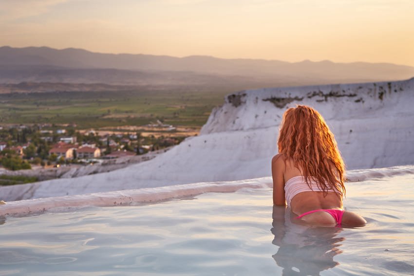Я відкриваю для себе білосніжні травертинові тераси Памуккале, розташовані приблизно за 549 кілометрів від Стамбула в Туреччині. Ці природні басейни, утворені 17 гарячими джерелами з температурою від 35°C до 100°C, простягаються на 60–70 метрів уздовж скелі заввишки 200 метрів і з 1988 року разом з античним містом Ієраполіс входять до списку спадщини ЮНЕСКО.